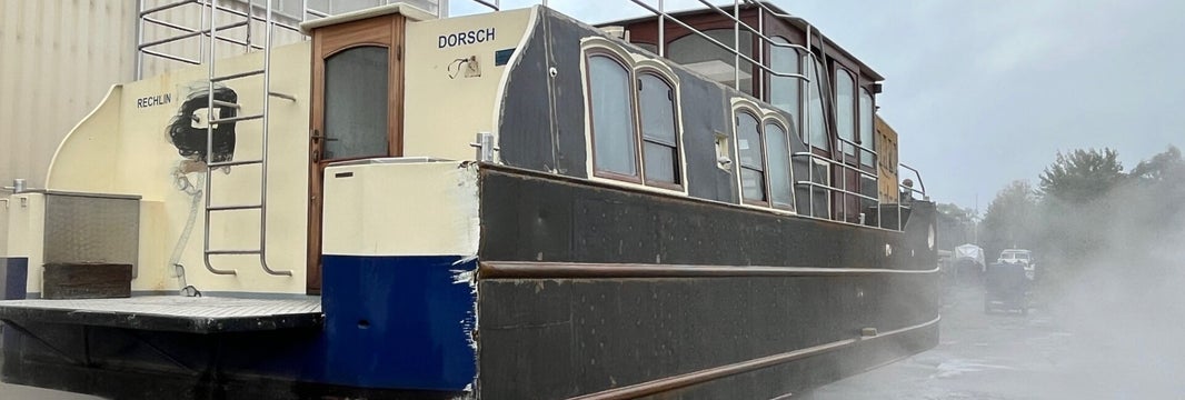 - Die Farbschichten werden mittels Wasserstrahlverfahren bis auf den Schwarzstahl entfernt. Alle Türen, Fenster und Bullaugen ausgebaut um die Lackierung komplett zu erneuern. Schleifen, grundieren, spachteln, schleifen....bis die Grundierung und der Unterwasserschutz fertig ist. Als letztes kommt die Bootsfarbe und die Beschriftung nach unseren wünschen